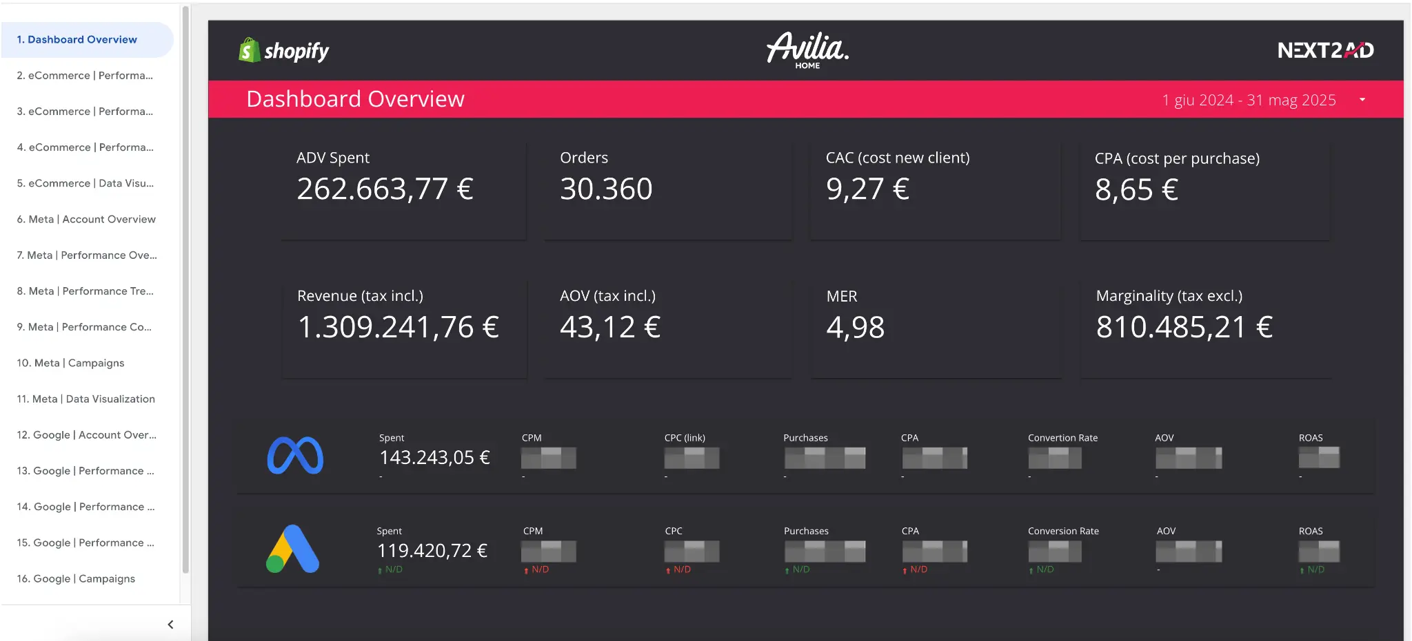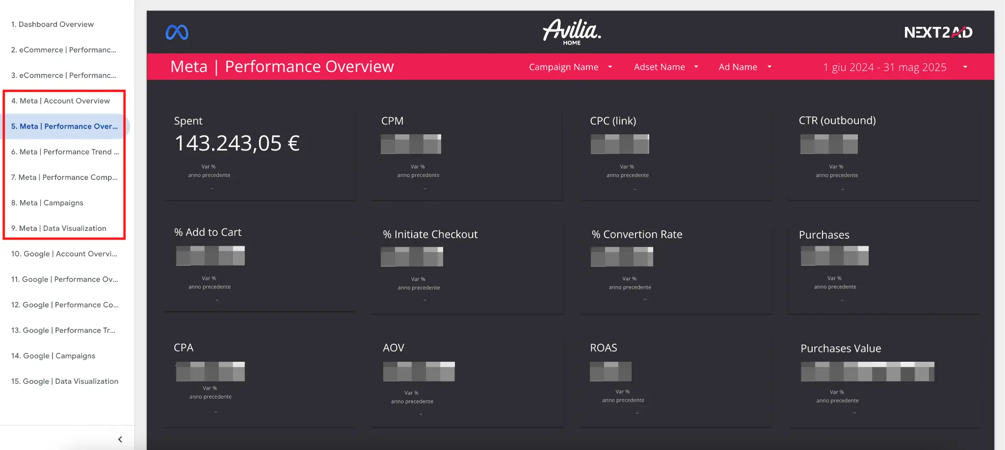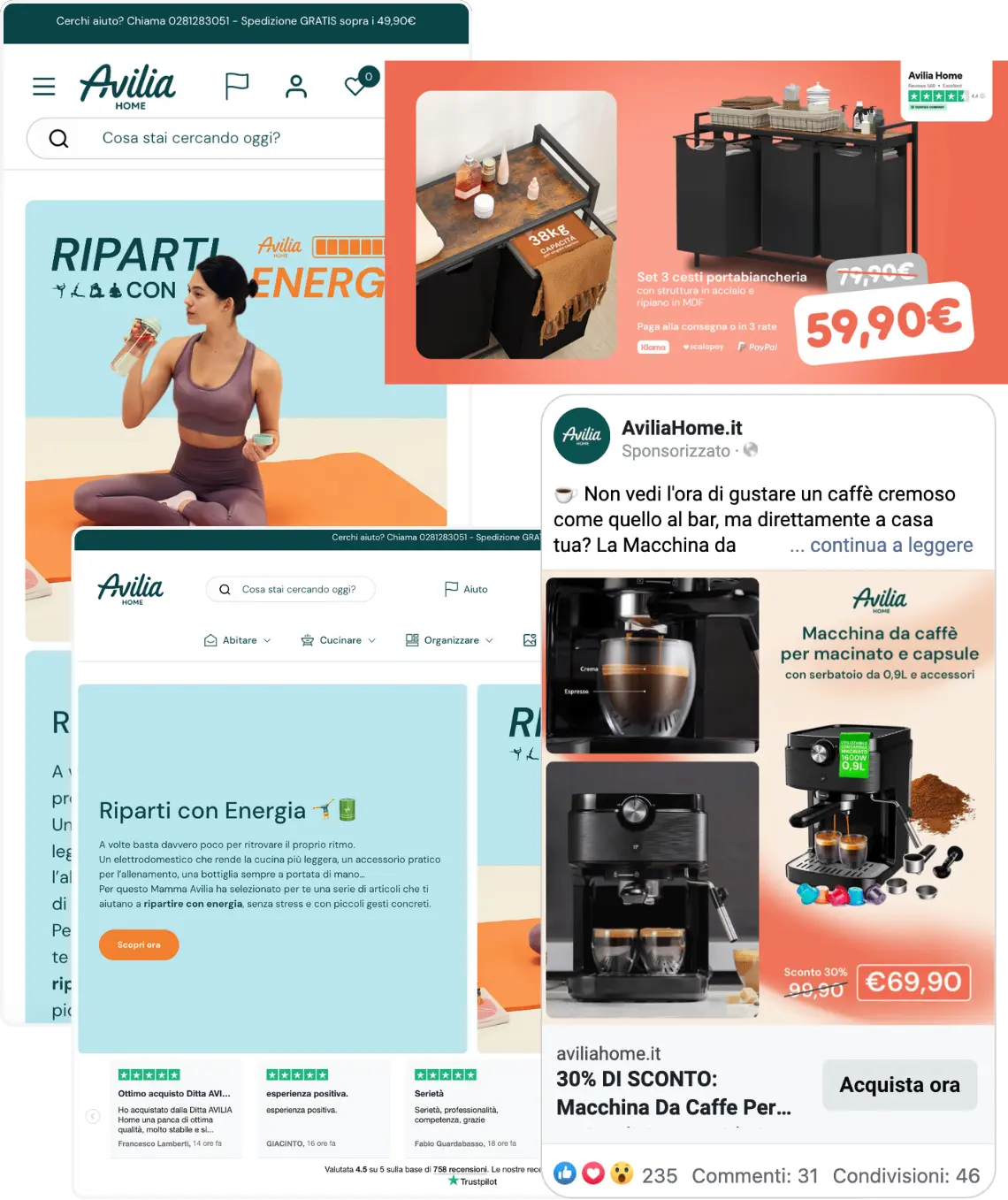 Grazie a questa struttura abbiamo potuto mantenere massimo controllo su CPA, ROAS, AOV, CR, ottimizzare le campagne in modo chirurgico e rendere visibile ogni singola leva attivata. La trasparenza e il monitoraggio continuo hanno rappresentato un pilastro strategico nella crescita sostenibile di Avilia Home.