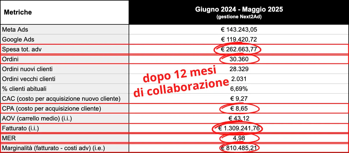 Il dato più rilevante: oltre €1.300.000,00 di vendite generate in 12 mesi solo dal canale eCommerce, con il 93% degli ordini provenienti da nuovi clienti, un’elevata marginalità e una struttura ads completamente sostenibile.