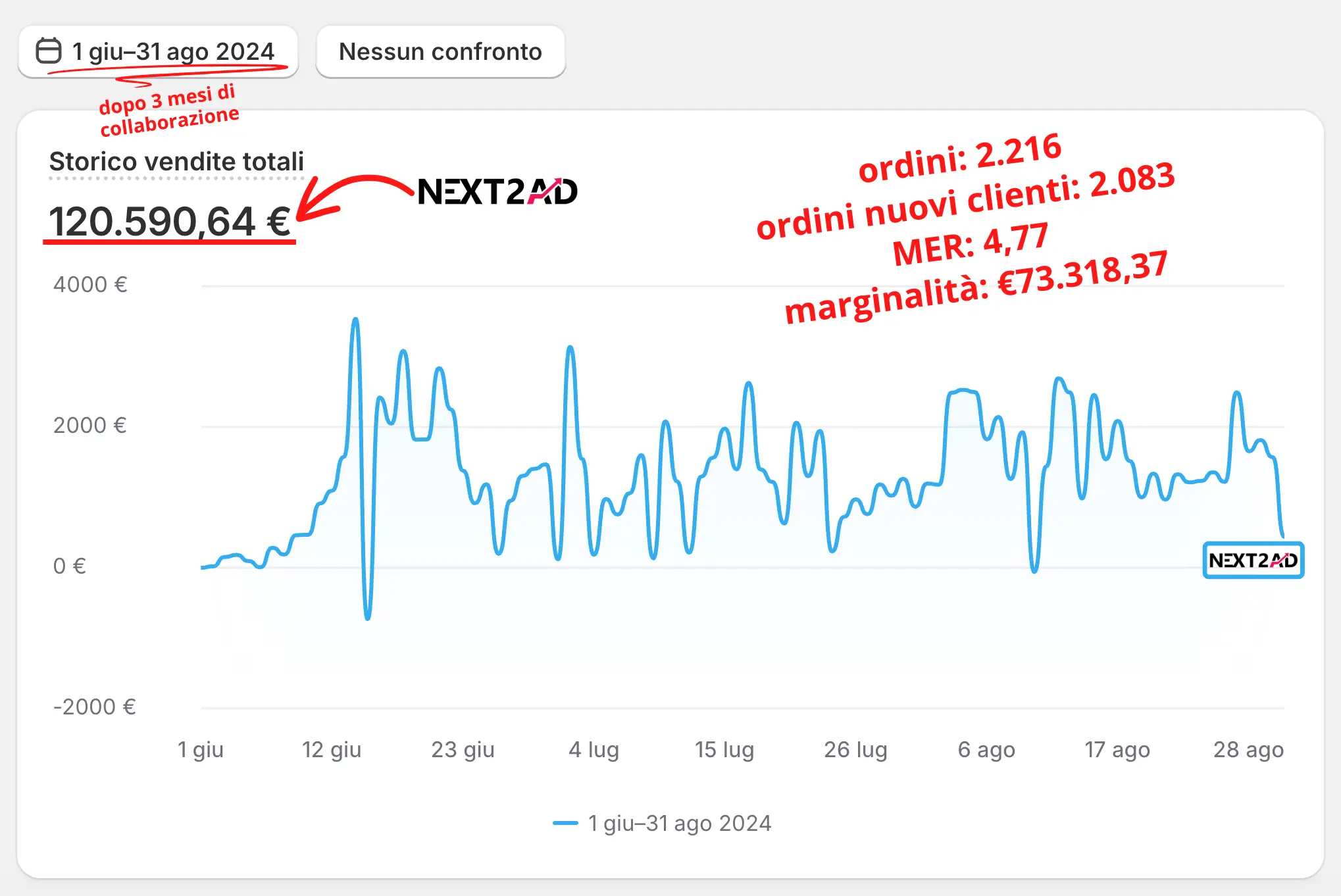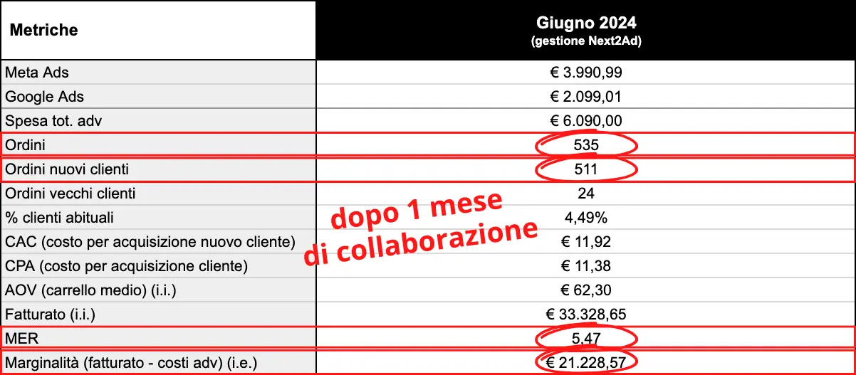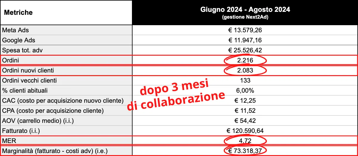 Dopo solo tre mesi di collaborazione, siamo riusciti a generare oltre 2.200 ordini, di cui 2.083 da nuovi clienti, raggiungendo un fatturato di €120.590,64 e una marginalità di €73.318,37. Con un MER di 4,72 il canale eCommerce stava continuando a crescere in modo profittevole e sostenibile.
