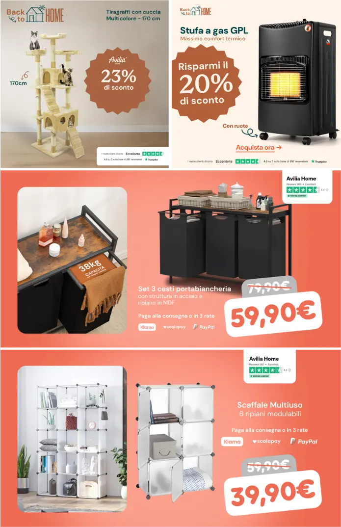 - Titoli e descrizioni USP-driven, focalizzati su plus concreti come spedizione gratuita, risparmio di spazio, capacità elevata (es. “38 kg” per i portabiancheria), comfort termico e possibilità di pagamento a rate;