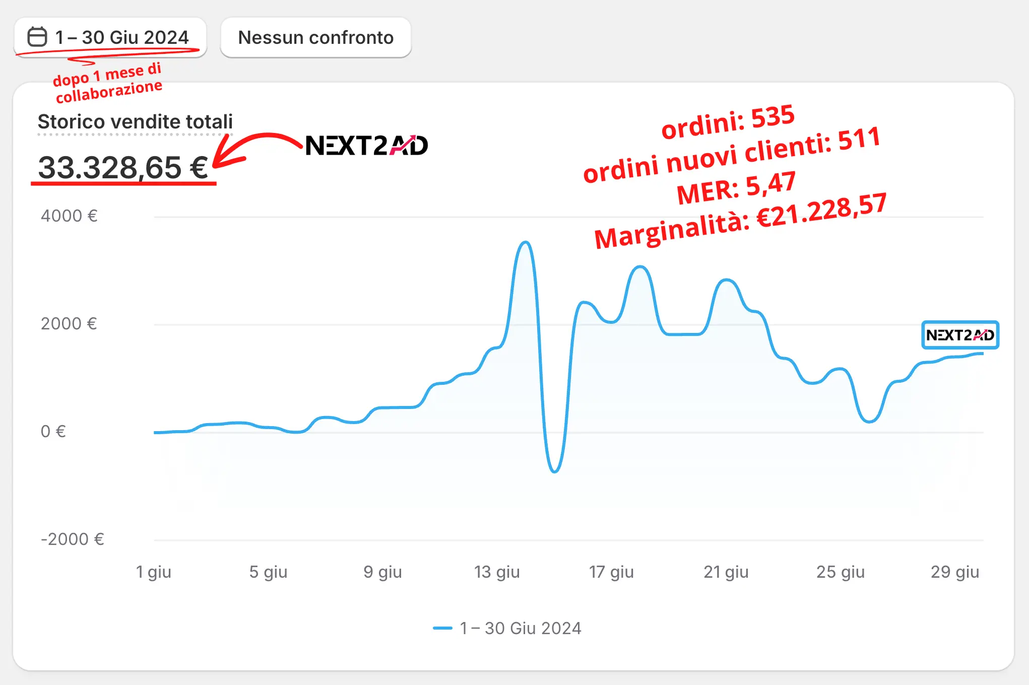 Dopo solo il primo mese di collaborazione, siamo riusciti a generare 535 ordini, di cui 511 da nuovi clienti, raggiungendo un fatturato di €33.328,65 e una marginalità di oltre €21.000,00. Con un MER di 5,47 il canale eCommerce si è dimostrato fin da subito sostenibile e pronto per essere scalato in modo profittevole.
