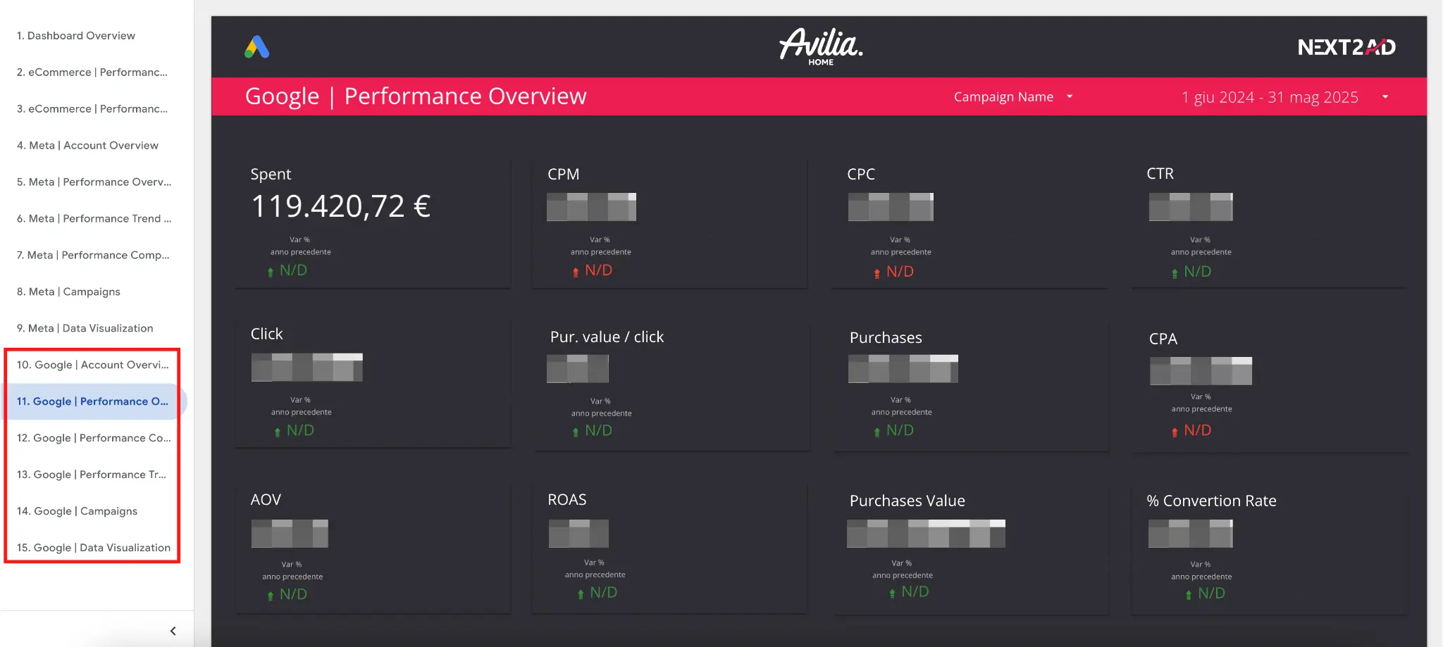 Anche su Google Ads abbiamo utilizzato diverse tab dedicate, pensate per supportare le decisioni strategiche e offrire una visione dettagliata e aggiornata delle performance, giorno per giorno.