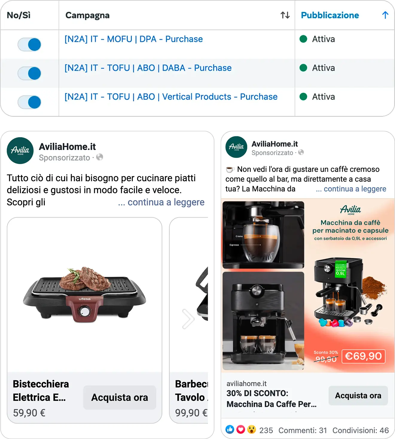 - DABA e DPA (per sfruttare l’ampio catalogo prodotti) per coprire prospecting e retargeting in modo efficace;