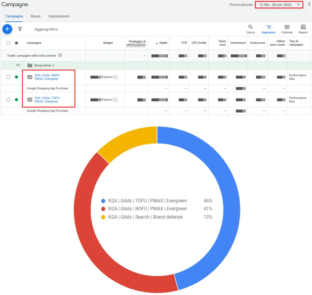 • Segmentazione avanzata delle campagne PMAX, suddividendo TOFU (Top of Funnel) e BOFU (Bottom of Funnel) per migliorare la conversione.