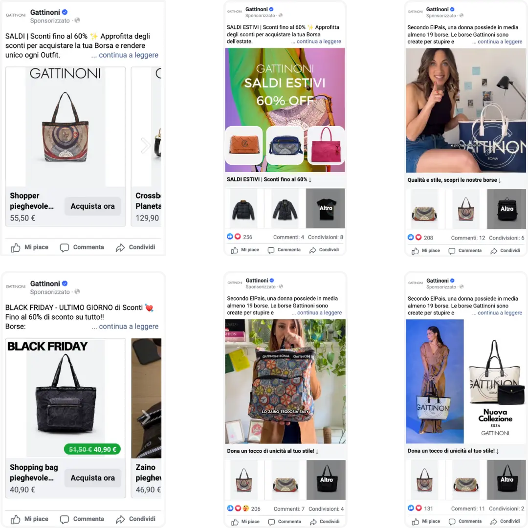 Per migliorare le performance pubblicitarie di Gattinoni su Meta Ads, abbiamo sviluppato una strategia basata su un mix di ottimizzazione della struttura delle campagne, il miglioramento delle creatività e una segmentazione del pubblico (tramite le creatività).