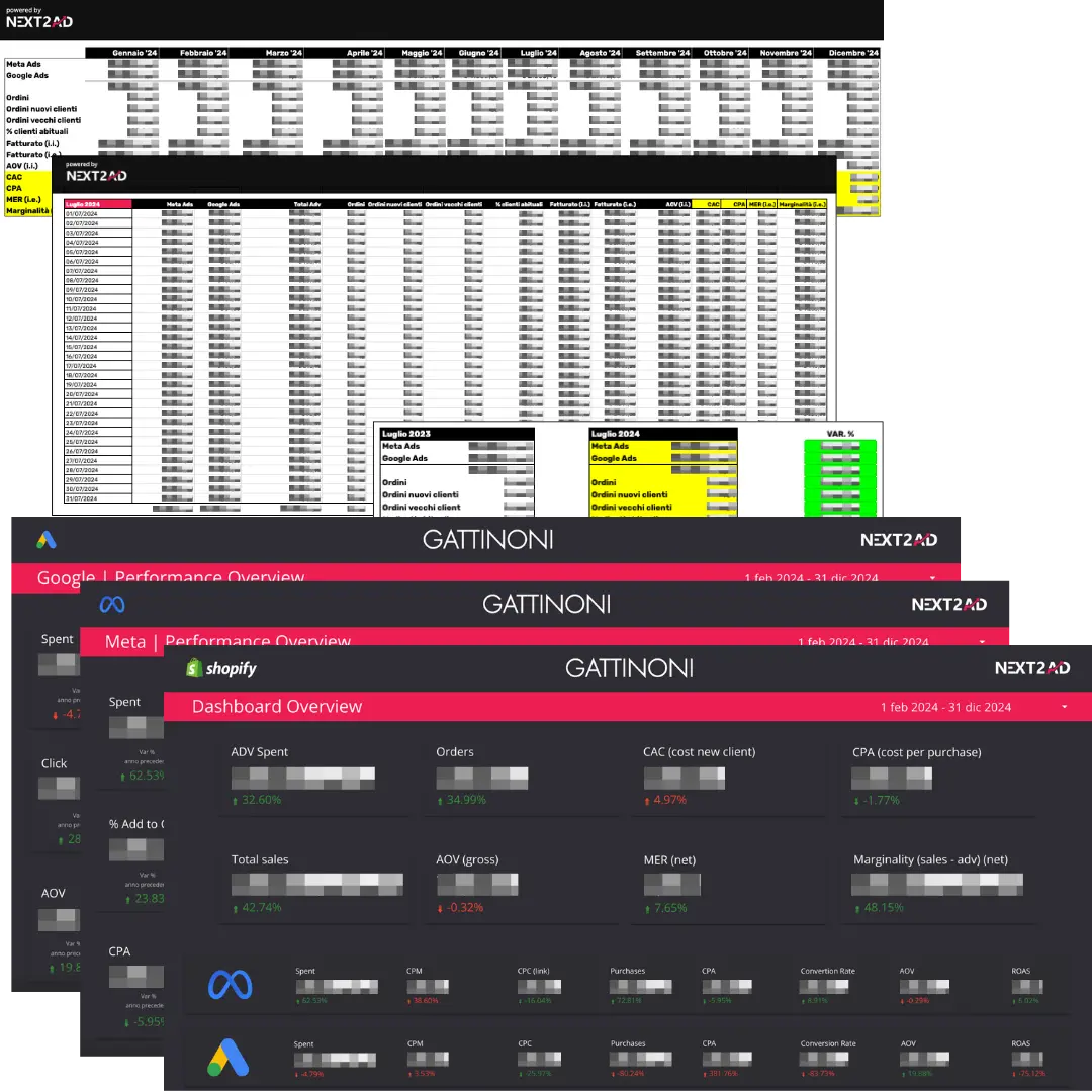 • Dashboard di Business Intelligence per monitorare in tempo reale KPI fondamentali come CPA, CAC, ROAS, MER, fatturato e margini.