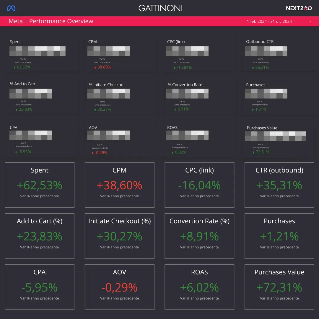 Le strategie implementate su Meta Ads hanno portato a un significativo miglioramento delle performance rispetto all’anno precedente, ottimizzando il rendimento delle campagne e aumentando la profittabilità dell’account.