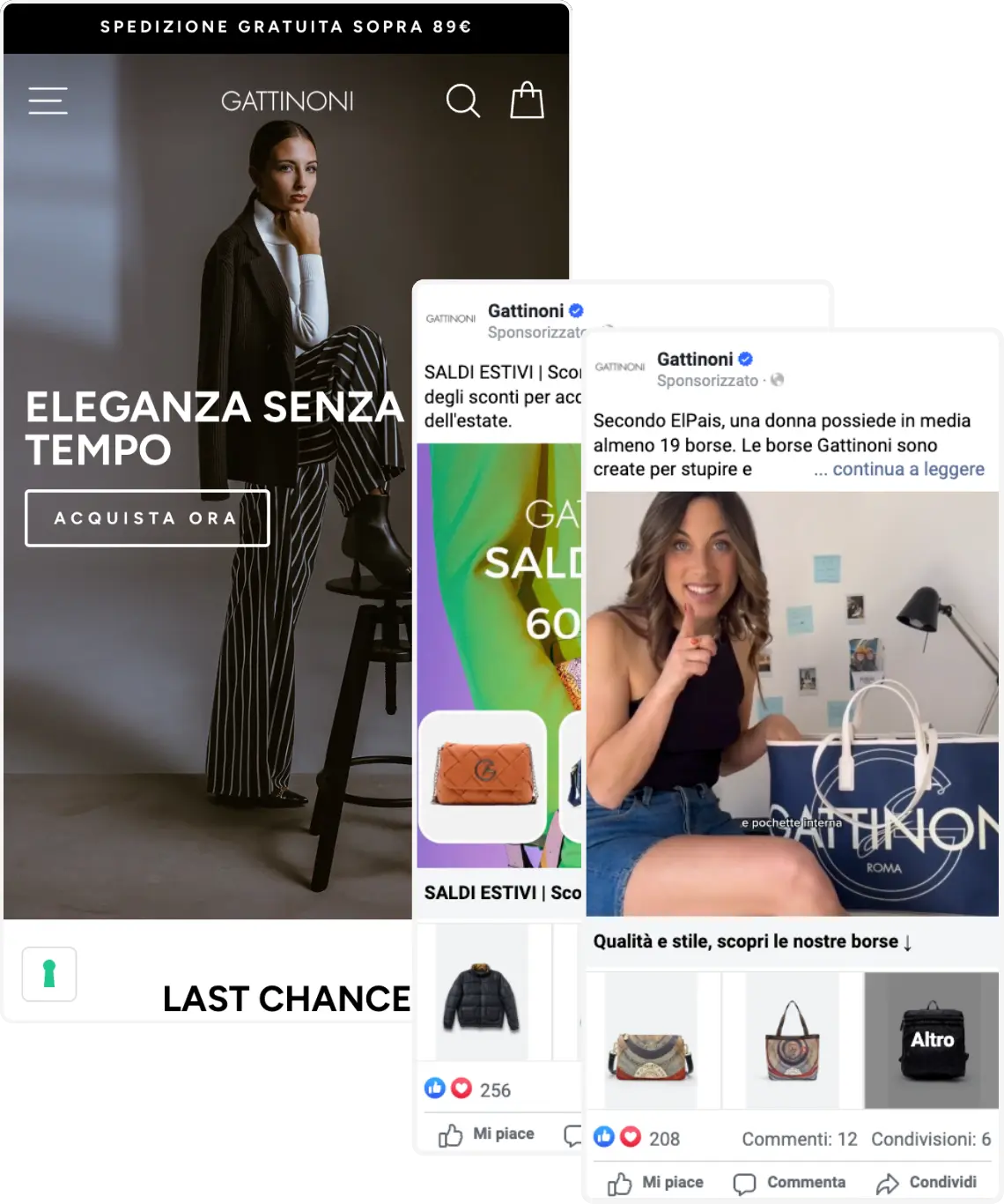 Per migliorare il rendimento delle campagne Google Ads di Gattinoni, abbiamo testato e implementato una serie di creatività altamente performanti, capaci di catturare l’attenzione del pubblico e incentivare la conversione.