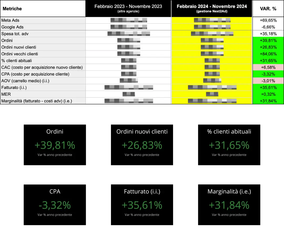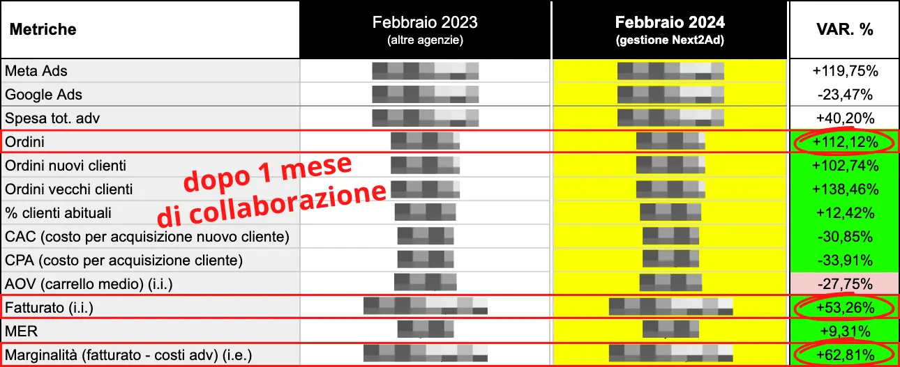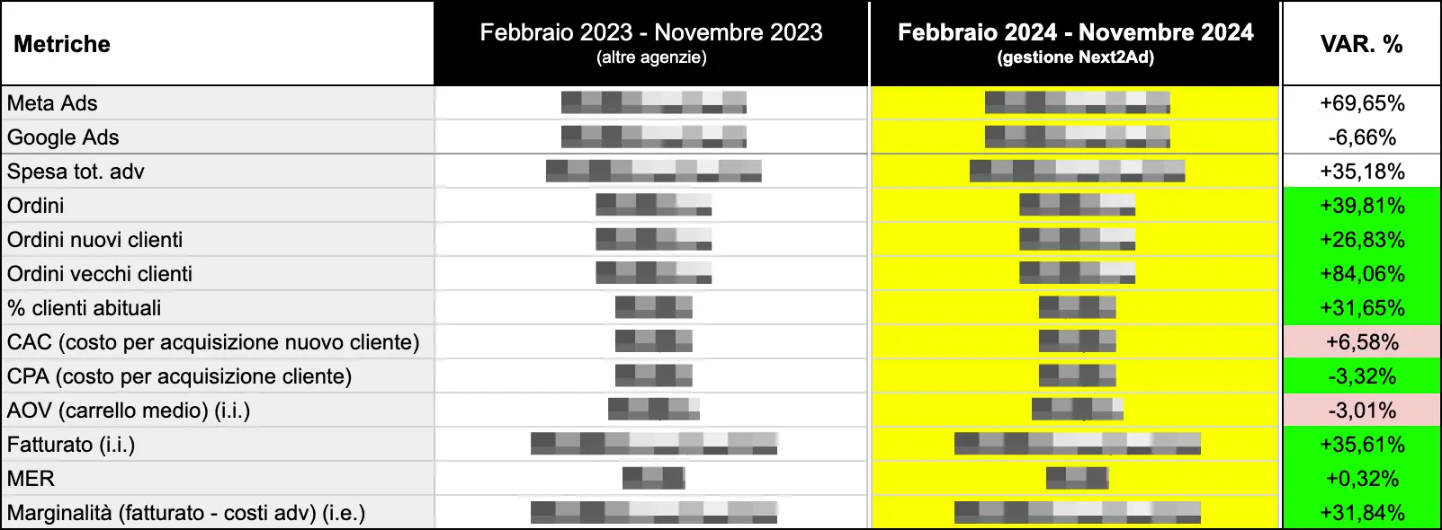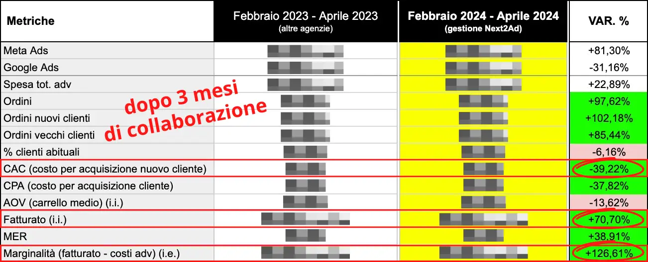 Dopo tre mesi di collaborazione abbiamo consolidato la crescita ottenuta, riducendo il costo per acquisire un nuovo cliente (CAC) del -39%, aumentando il fatturato del +71% e la marginalità del +127% rispetto all’anno precedente, confermando la sostenibilità e la scalabilità della strategia adottata.