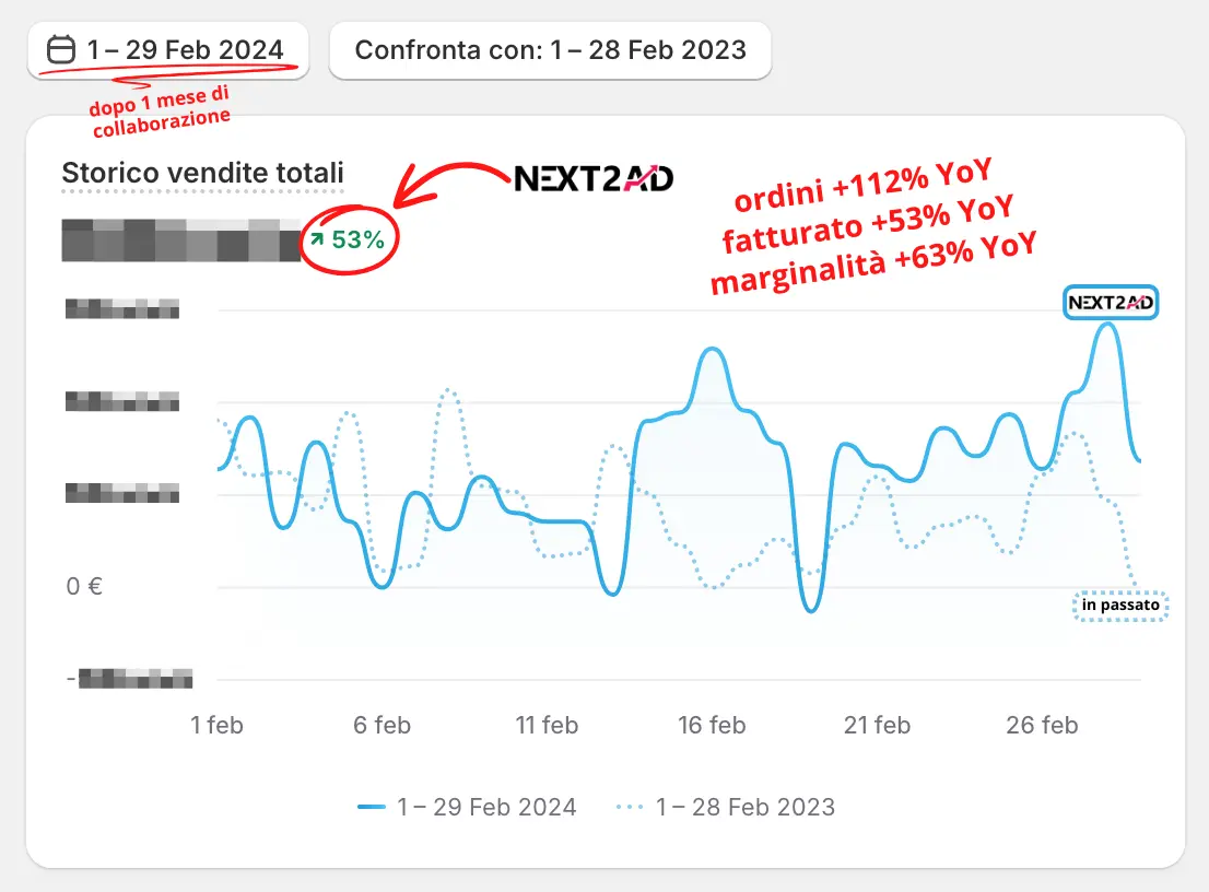 Dopo solo il primo mese di collaborazione: +112% di ordini, +53% di fatturato e +63% di marginalità rispetto all’anno precedente, dimostrando l’efficacia del nostro approccio data-driven.