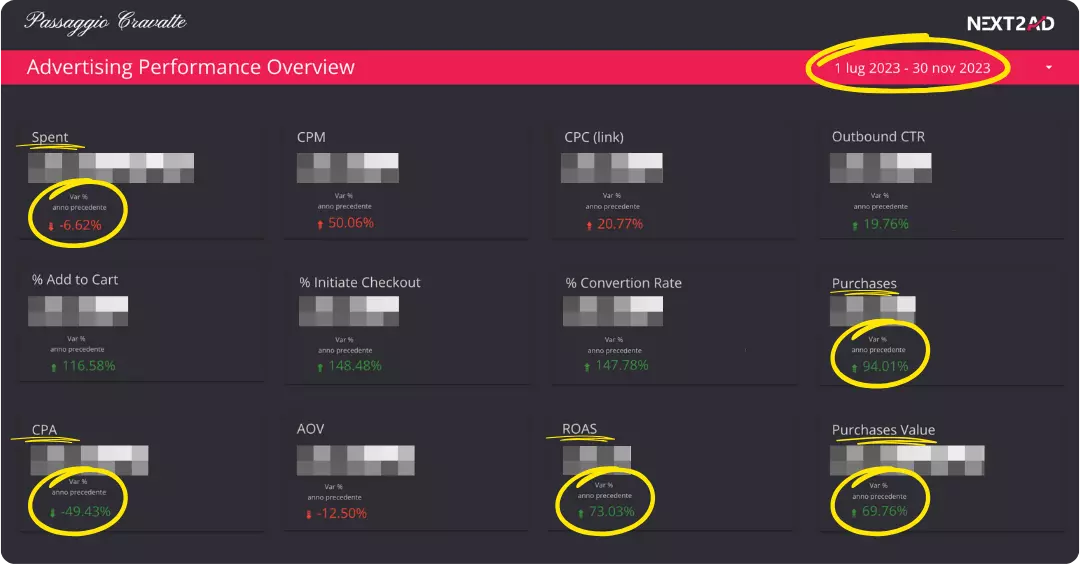 Attraverso strategie basate sui dati, analisi economico-finanziarie dell’eCommerce, strategie avanzate su Facebook Ads, realizzazione di creatività che rispecchiassero il posizionamento del brand, analisi e ottimizzazione del CRM, Passaggio Cravatte tra il 1 Luglio e il 30 Novembre 2023 ha registrato i seguenti risultati: