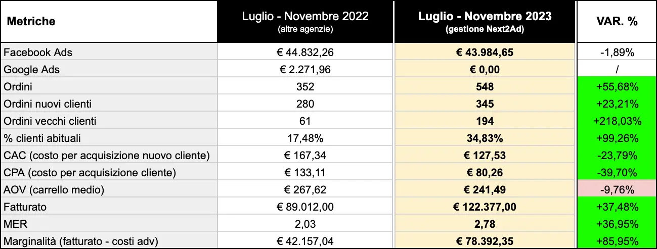 In questa fase siamo riusciti a ridurre il costo per acquisire un nuovo cliente del -79,48%, aumentare il fatturato del +75,16% e incrementare la marginalità del +261,99%.