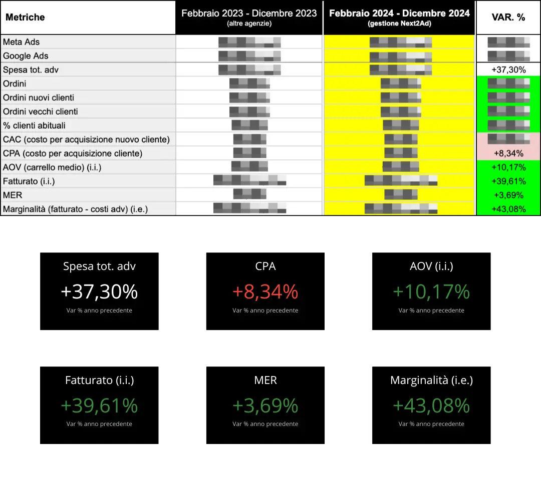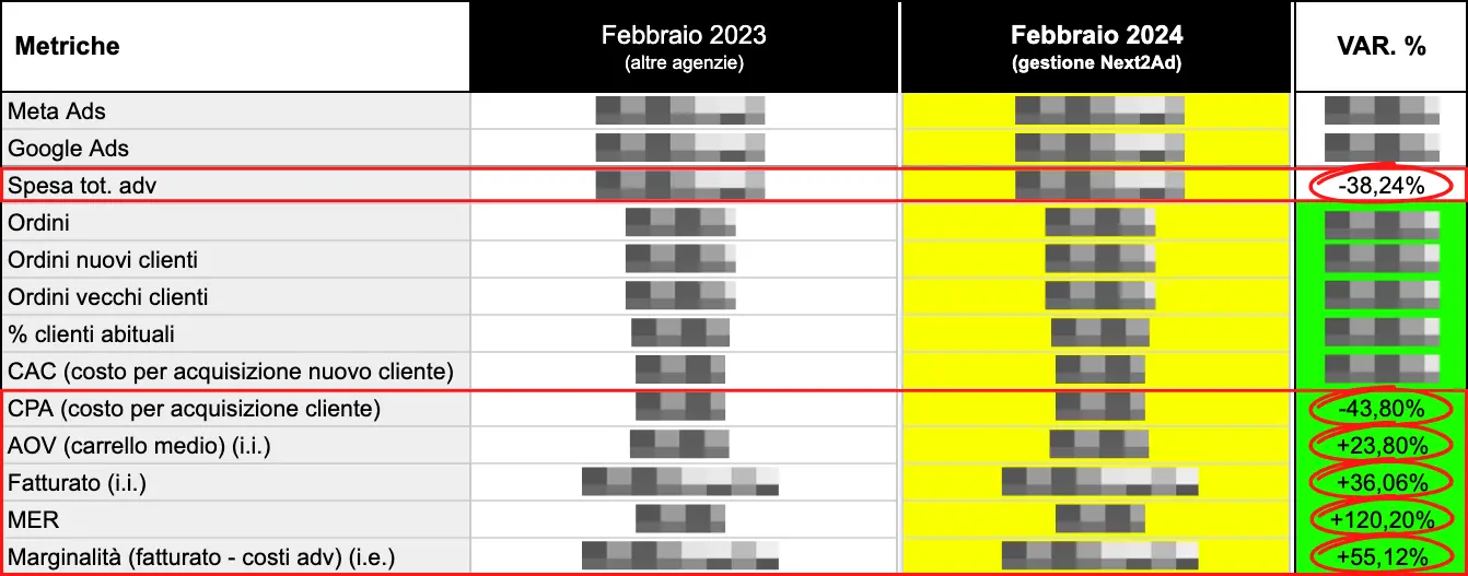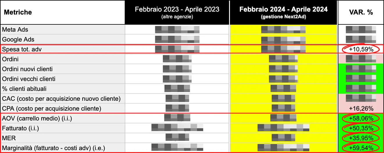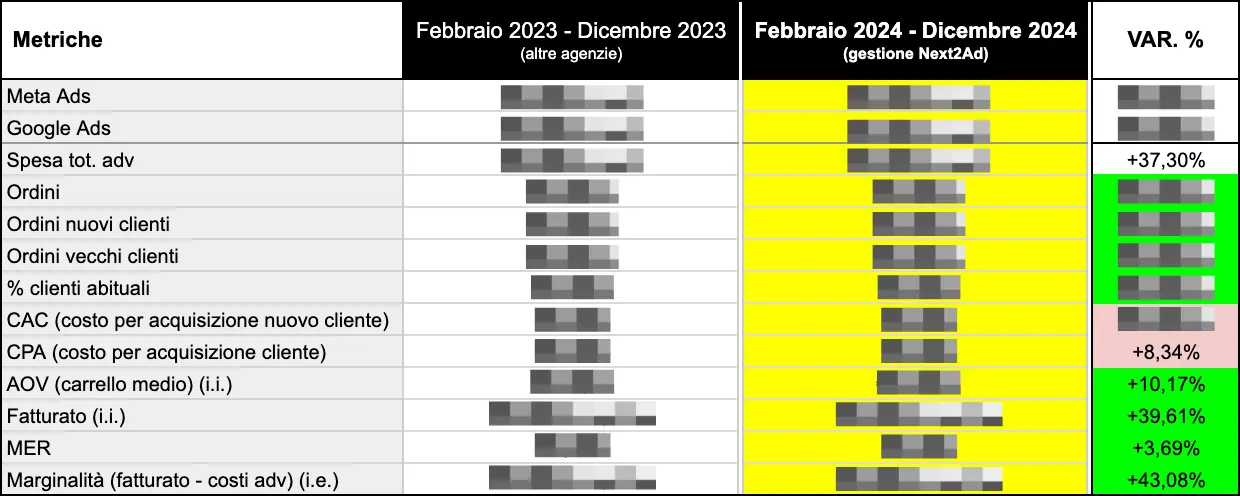 Con una misurazione ad hoc, potevamo analizzare e ottimizzare la spesa pubblicitaria, numero di ordini, ordini nuovi clienti, ordini vecchi clienti, % clienti abituali, fatturato, AOV, CAC, CPA, MER e marginalità.