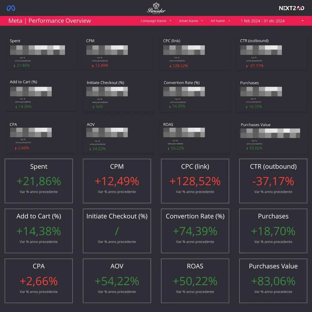 Grazie a queste strategie, le campagne su Meta Ads hanno portato risultati tangibili, registrando, rispetto allo scorso anno, un ROAS del +50,22% e un aumento significativo del valore totale degli acquisti del +83,06%, confermando la profittabilità delle soluzioni implementate.