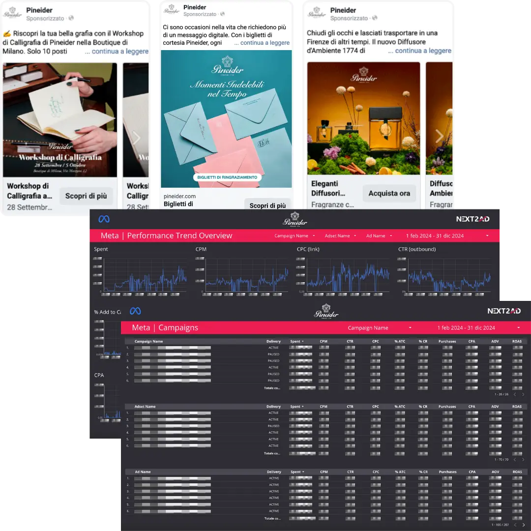 - Grazie alla nostra N2A Performance Dashboard, Pineider ha potuto accedere a una visione chiara e trasparente delle performance di ogni canale pubblicitario (CPM, CPC, CTR, CPA, ROAS, Convertion rate, etc.) e i dati di back-end dell’eCommerce. Questa soluzione di business intelligence ha permesso di aggregare i dati in un’unica piattaforma, facilitando l’ ottimizzazione della distribuzione del budget e consentendo di prendere decisioni rapide e informate.