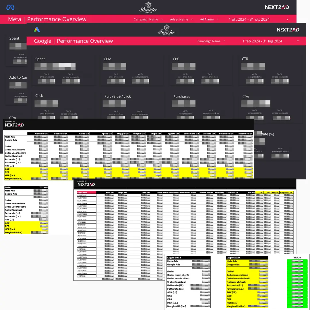 - Abbiamo integrato i nostri strumenti di Data Analysis e Business Intelligence per monitorare e ottimizzare in tempo reale ogni metrica chiave: spesa adv, ordini, ordini nuovi clienti, ordini vecchi clienti, % clienti abituali, fatturato, AOV, CPA, CAC, MER, marginalità.
