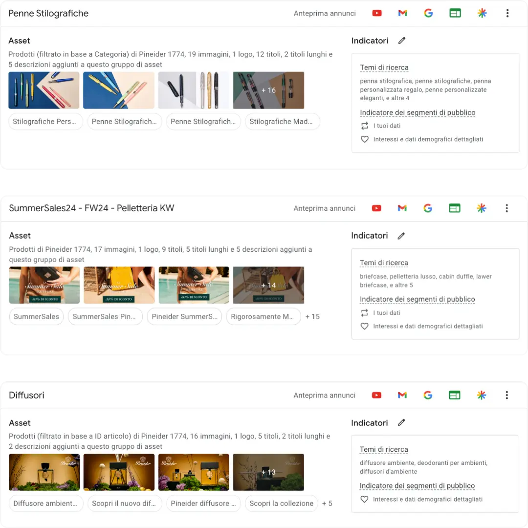 Le creatività utilizzate su Google Ads hanno avuto un ruolo chiave nel trasmettere l’artigianalità e l’esclusività di Pineider, migliorando le performance delle campagne.
