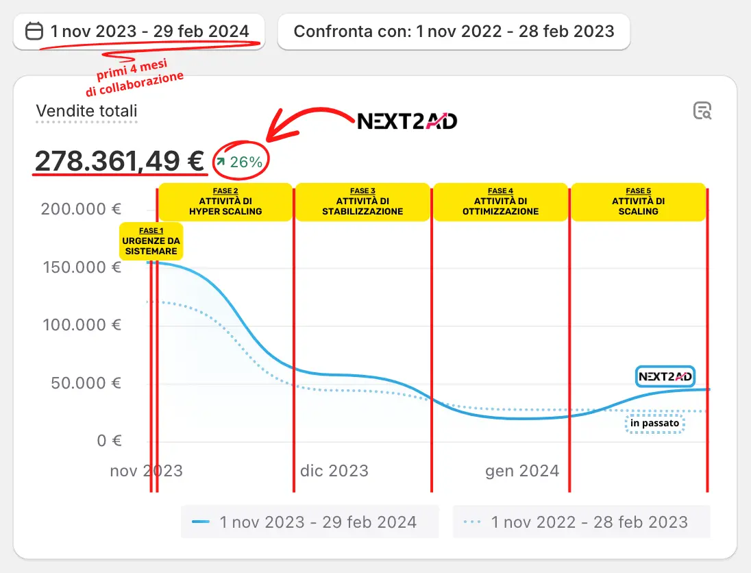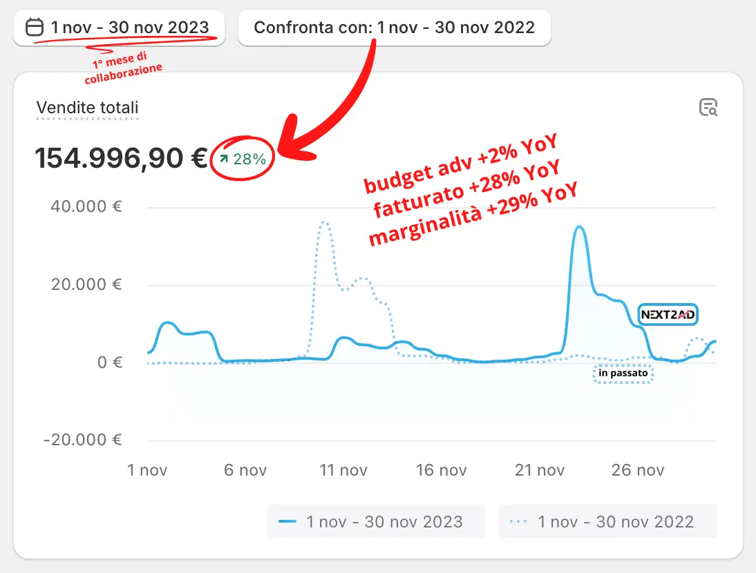 Dopo solo il 1° mese di collaborazione, con solo un aumento del budget adv del +2%, siamo riusciti ad incrementare il fatturato del +28% e aumentare la marginalità del +29% rispetto all’anno precedente.