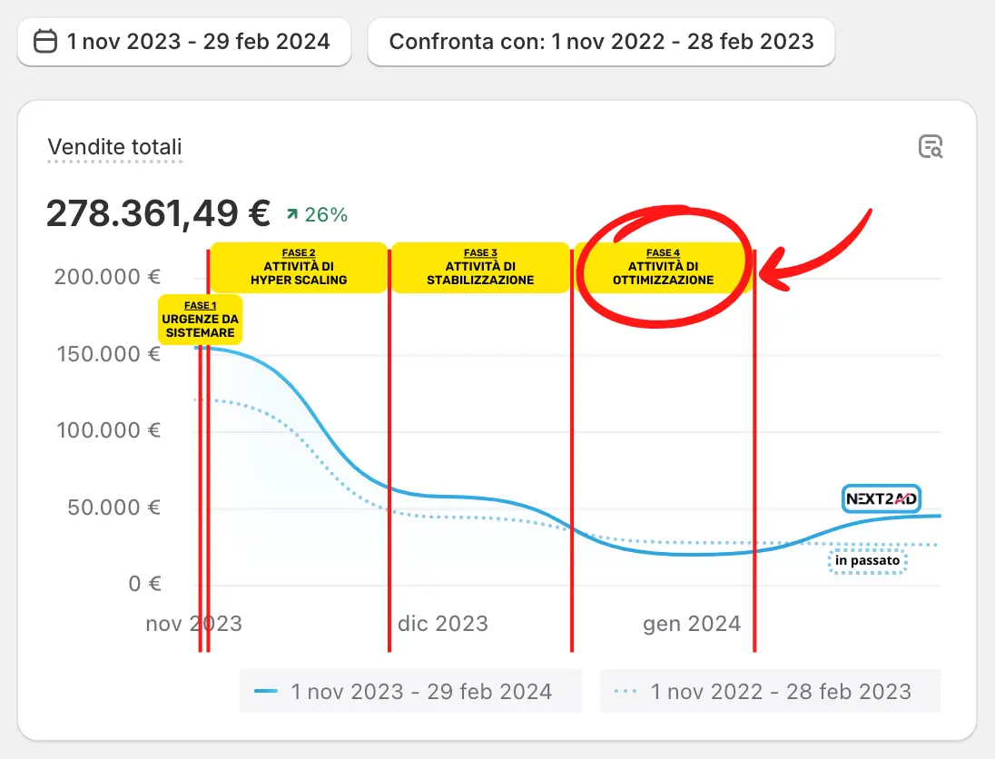 Grazie ad una profonda analisi dei dati storici, ci ha permesso di identificare 5 differenti fasi di attività (strategica e operativa), che abbiamo differenziato a seconda del periodo/stagionalità. Questo ci ha permesso di ottimizzare al massimo il budget pubblicitario che avevamo a disposizione e di ottenere il miglior risultato possibile.