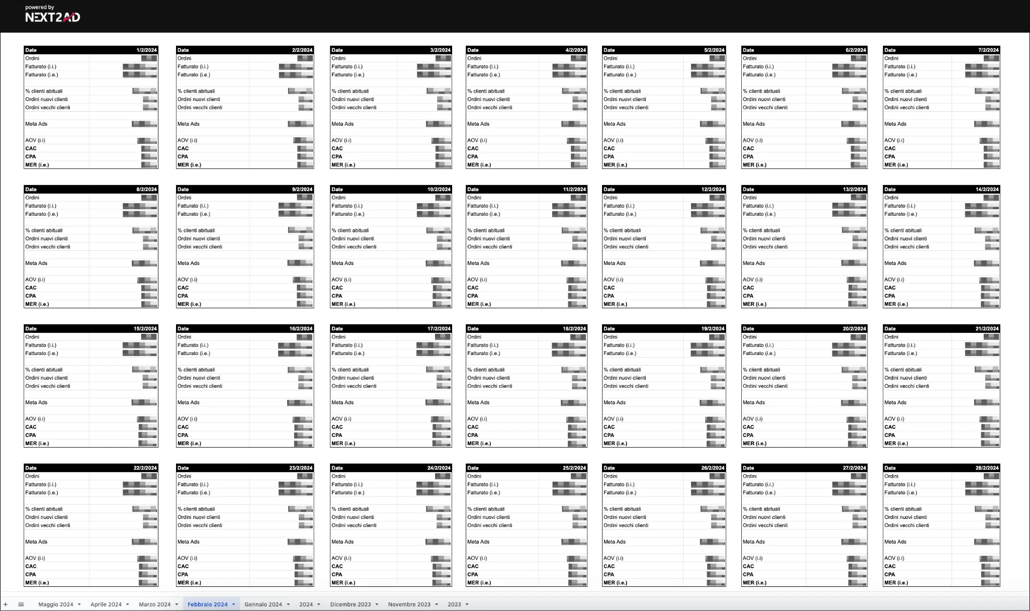 - Dashboard di Analisi dei dati: il cliente non aveva mai avuto controllo dei dati e i suoi dati non erano puliti. Abbiamo realizzato una dashboard di business intelligence in grado di avere il dato in tempo reale della spesa pubblicitaria, fatturato, CAC, CPA, MER, etc. e svolto una attività su google sheet giornaliera integrando le API dell’eCommerce e di Facebook Ads.