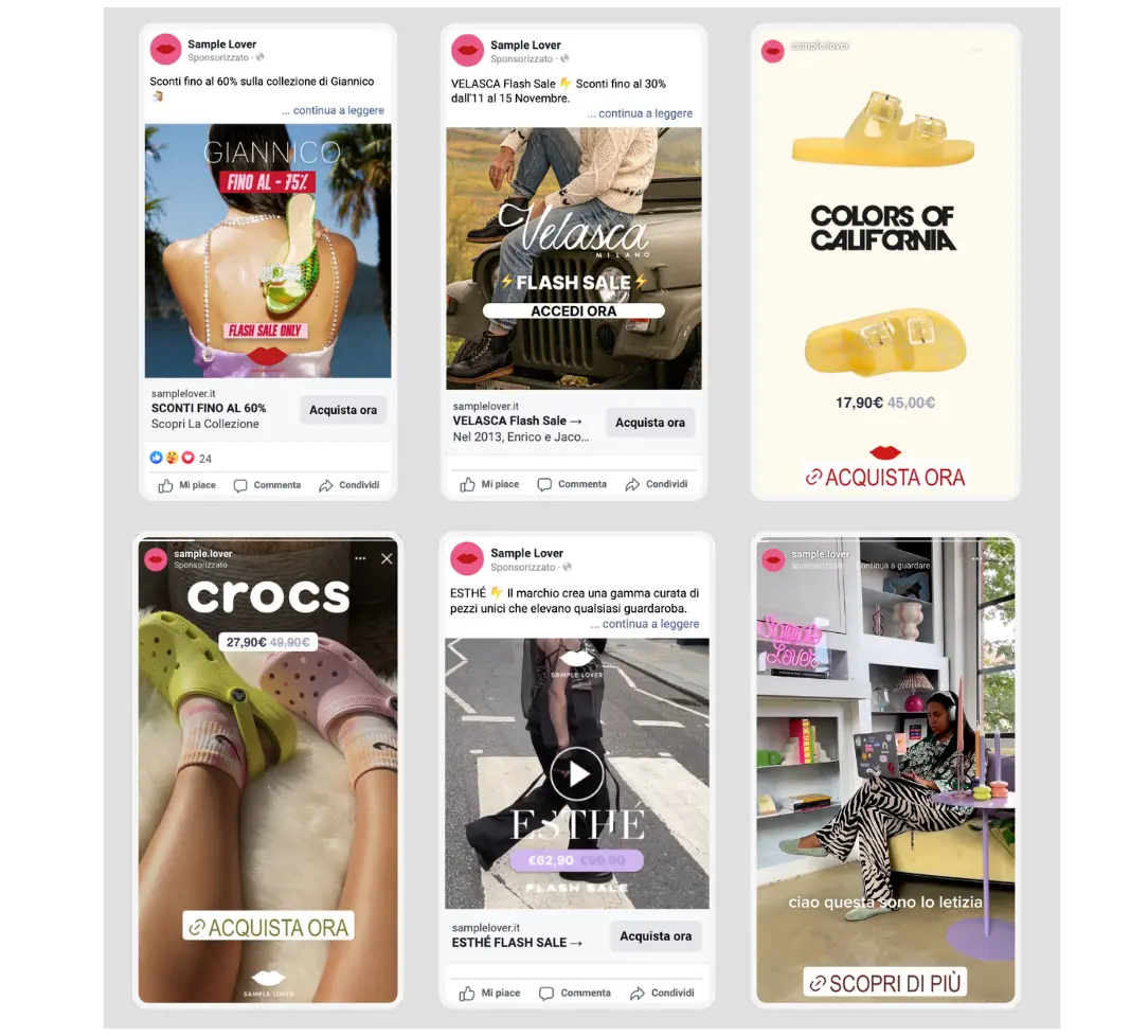 - Ideazione di creatività e copy con focus al prodotto e brand offerto, prezzo (scontato), urgenza e scarsità.