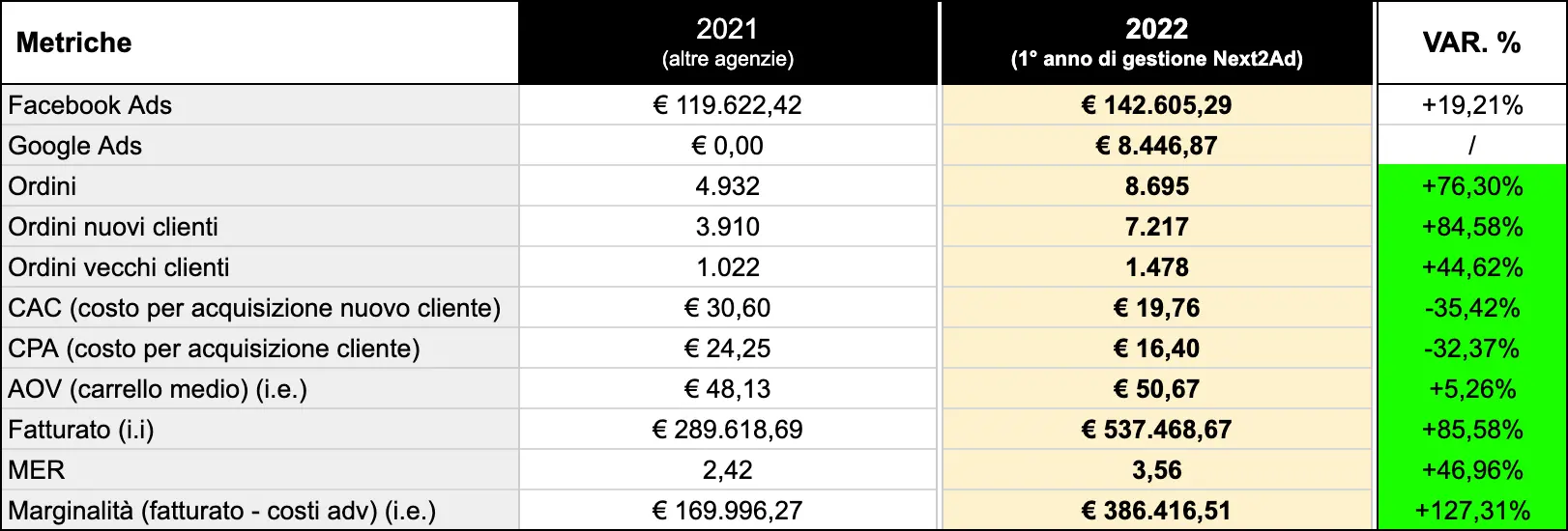 Questa combo di variabili positive ci ha permesso di ottenere, con addirittura una riduzione del -49% del budget pubblicitario (rispetto all’anno precedente), un aumento del fatturato del +55%.