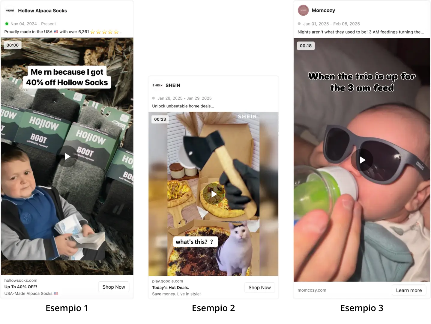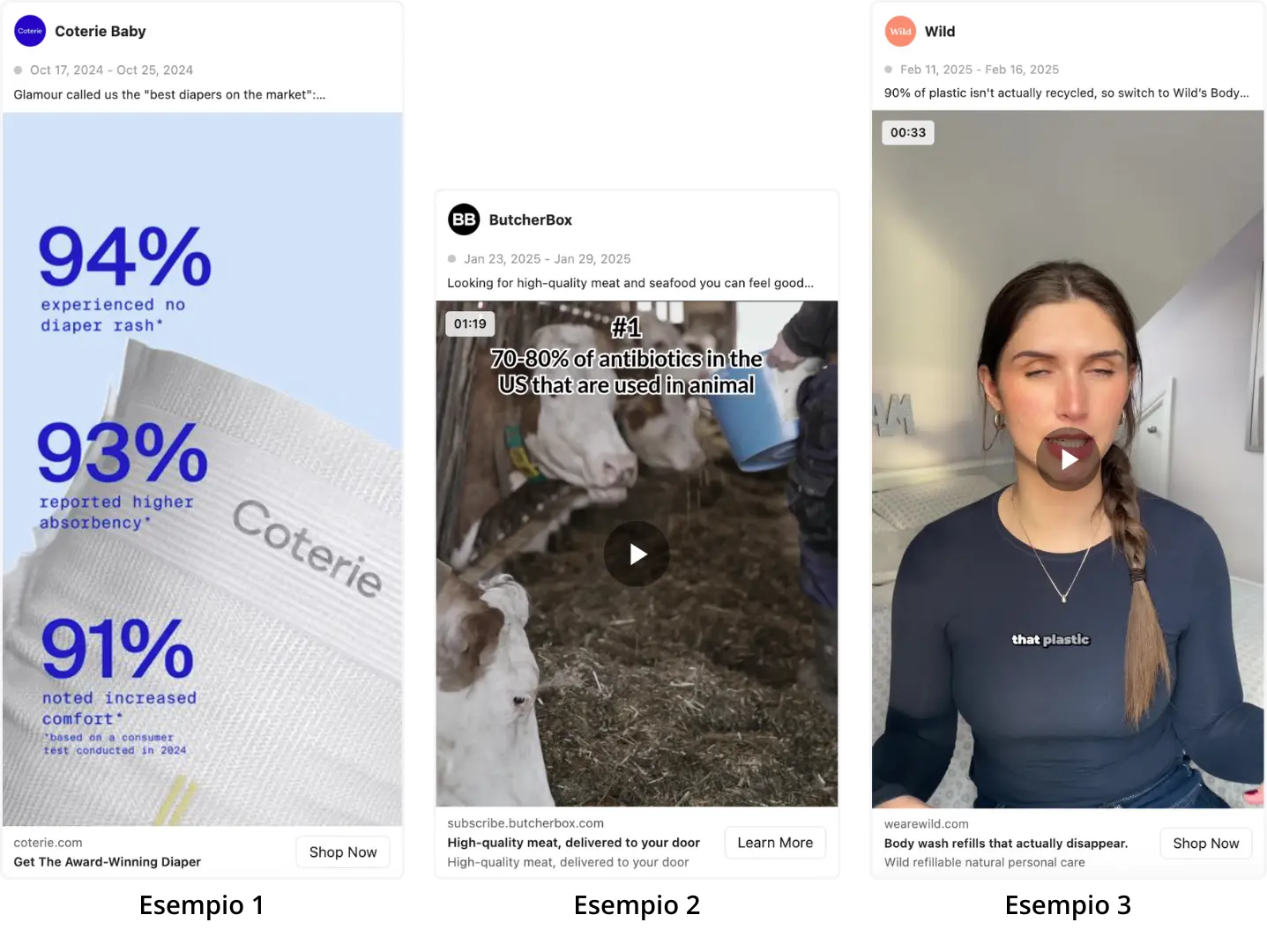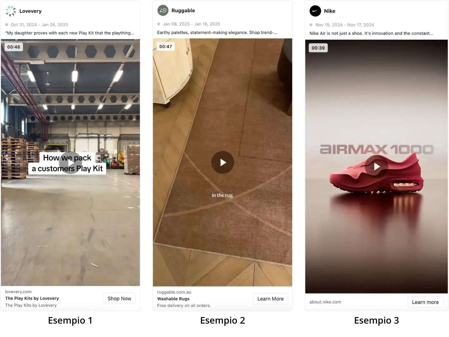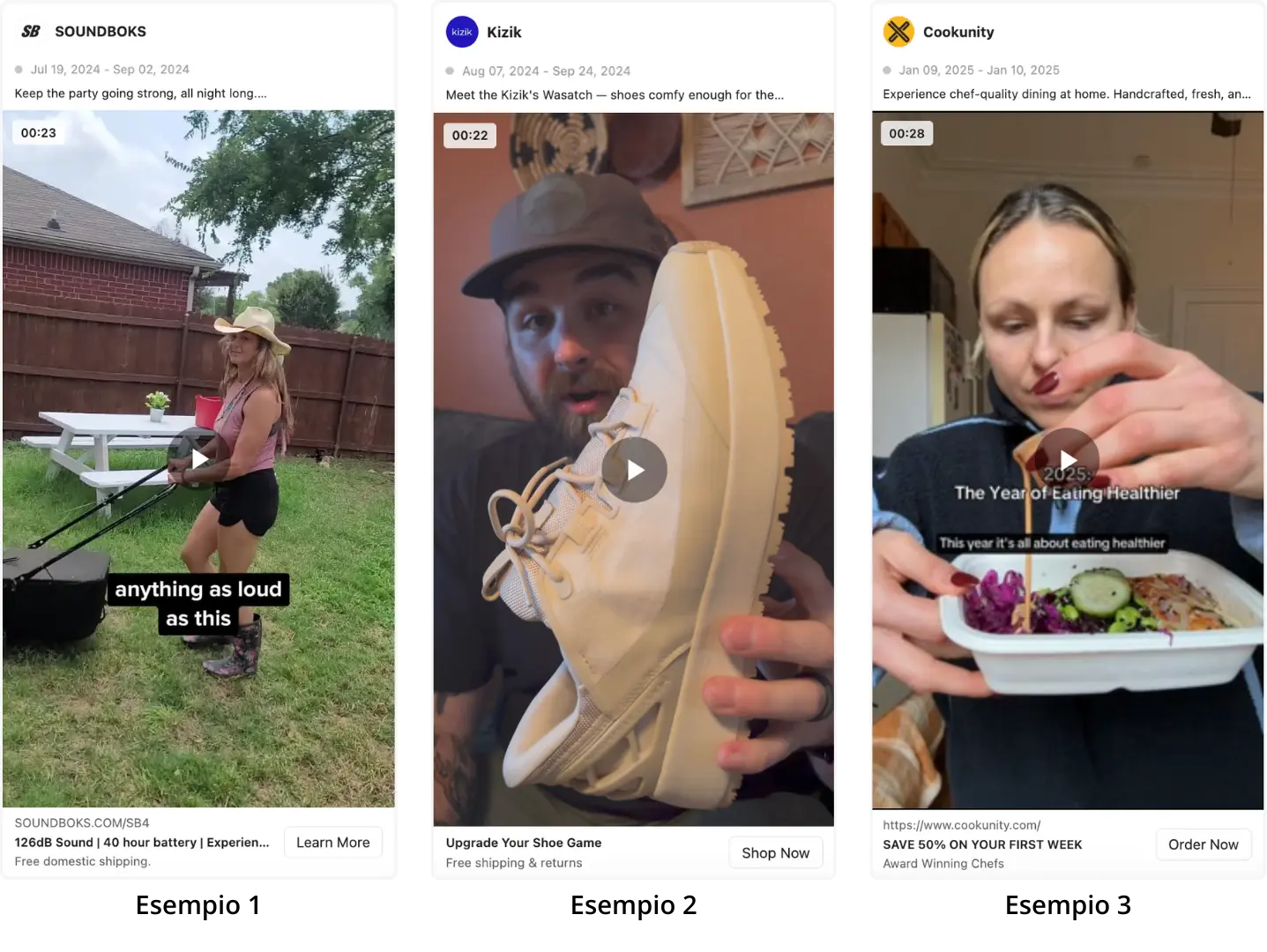 Esempi di applicazione in creatività immagine, carosello o video;