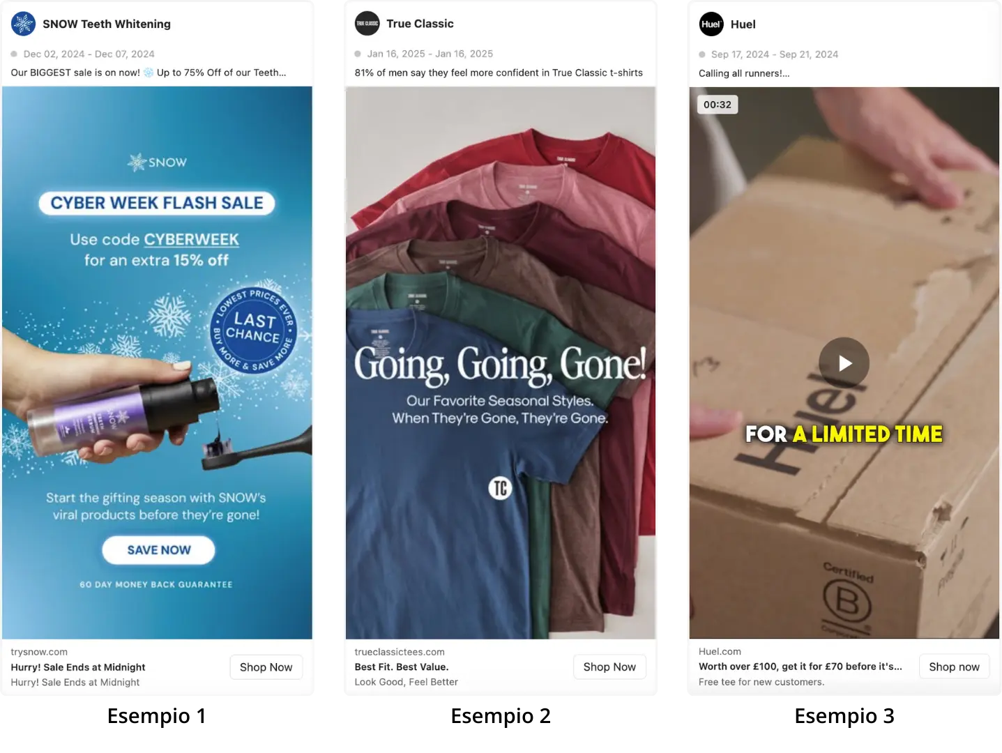 Video ad con call iniziale fortissima: “🚨 Saldi flash — solo 48 ore per risparmiare il 40%!”, seguito da mostra del prodotto in uso.